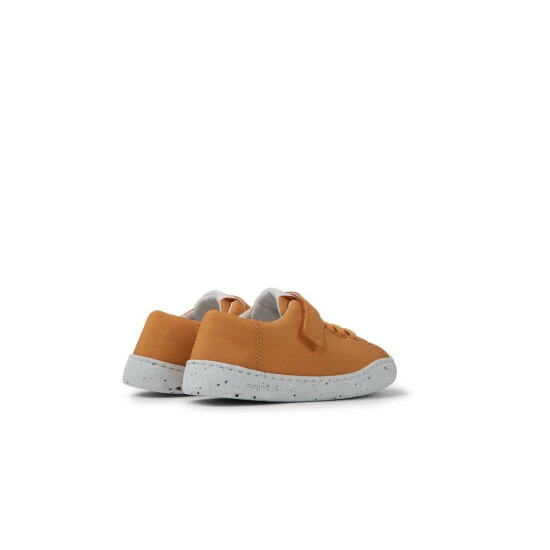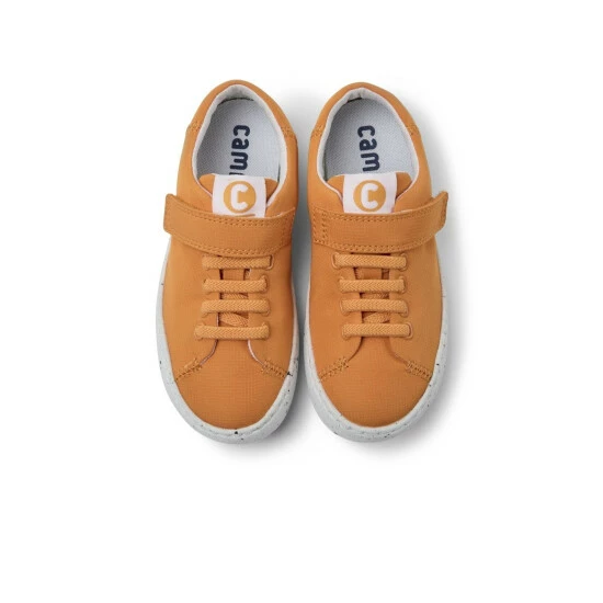Orange recycled PET fabric kids’ sneakers with recycled PET laces, hook-and-loop closing system, and 100% EVA outsoles (20% recycled). Peu Touring is a sportier version of our iconic Peu, enhanced with technical upgrades and a recognizable curve on the outsole.